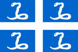 A bandeira da ilha Martinica foi criada em 4 de agosto de 1766 e deixou de ser usada em 1790 na Revolução Francesa. Quase duzentos anos depois foi recuperada para uso não oficial porque o estandarte oficial da ilha, uma dependência francesa, é a bandeira tricolor francesa. A bandeira de Martinica de uso não oficial, deriva do antigo estandarte usada pela marinha mercante francesa durante o século XVIII até a adoção da bandeira tricolor. É um pano de cor azul cortado por uma cruz branca. Em cada quadrado aparece representada uma serpente branca com forma de “L” invertida (mais visível no desenho do século XVIII que na actual). As serpentes tem forma de “L” porque a Martinica dependia de Santa Lúcia antes da conversão desta última em uma colônia do Reino Unido. |