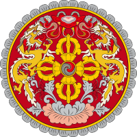 O brasão de armas mantém vários elementos da bandeira do Butão, ligeiramente diferentes dos originais, e contém muito simbolismo budista. A designação oficial é: "O emblema nacional, contido num círculo, é composto por um duplo diamante-raio (dorji) colocado acima de um loto, encimado por uma joia e emoldurado por dois dragões. O raio representa a harmonia entre o poder secular e o poder religioso. O lótus simboliza pureza, a joia manifesta o poder soberano, e os dois dragões, macho e fêmea, defendem o nome do país que proclama com a sua grande voz, o trovão". |